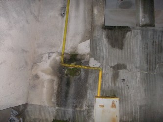 din tencuiala blocului. Crăpătura se întinde pe toată lungimea scărilor, iar sus, pe platformă devine exagerat de mare. Pe stânga, o balustradă de beton cu o crăpătură de-ţi încape mâna în ea, trece în zig-zag, de parcă Zorro ar fi tras liniile cu sabia-i ascuţită. Pe partea exterioară a betonului se află branşamentul de la gaz. Sus, pe platformă fisura de acum un an s-a făcut o gaură în toată regula. Bucăţi de beton cad, bucată cu bucată, zilnic câte un pic, tasând şi mai tare molozul de sub