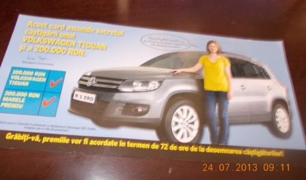 Zilele trecute am primit prin poştă o bucată de carton ce semăna cu o carte poştală de pe vremuri. „Acest card ascunde secretul câştigării unui Volkswagen Tiguan şi a 200.000 Ron”, mă anunţa expeditorul cu litere mari, galbene, în colţul din stânga sus. Pe tot spaţiul rămas se lăfăia un autoturism argintiu, de care sta rezemată o blondă absolut decent îmbrăcată, iar într-un chenar – rezumat erau bifate 100.000 Ron maşina şi 200.000 Ron Marele Premiu! Cu litere abia perceptibile era semnătura Irinei Popescu, managerul concursului. Pe fond negru, chiar pe marginea de jos a cardului eram sfătuită să mă grăbesc, pentru că premiile vor fi acordate în termen de 72 de ore de la desemnarea câştigătorilor!