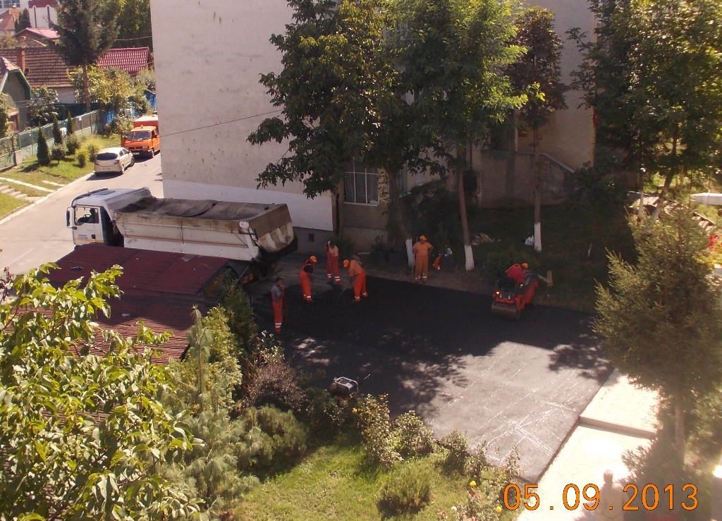 Chiar dacă au o bucată generoasă de teren acoperit cu mari dale de beton, ei rezolvă pe căi numai de ei ştiute, asfaltarea! Terenul, cândva spaţiu verde, teren de joacă pentru puştimea din blocuri, într-o zi şi-a schimbat destinaţia. O parte din el a devenit grădină cu trandafiri, iar cealaltă parcare. Nu mai e un secret pentru nimeni că cel care se ocupă de schimbările astea e un om influent. E doctorul care lucrează ca un sclav pe plantaţie, într-un cabinet cu circuit închis. La el vin doar clienţi care au nevoie de parcare şi sunt recomandaţi de cineva, din moment ce cabinetul nu are firmă! E împânzită zona cu camere de supraveghere şi oricât ar suna la poartă, acolo nu intră oricine!Ieri, pe la prânz a venit un camion, nişte muncitori şi înainte de apusul de soare parcarea proaspăt asfaltată a şi fost dată în folosinţă! Lucrarea aceasta nu am găsit-o pe lista străzilor ce sunt în programul de reabilitare în 2013, dar bine că au fost fonduri, oameni şi voinţă de a realiza aşa o minunăţie! Arată beton! Vreau să zic, asfalt! Dar să vedeţi imaginile, să nu ziceţi că mă laud!