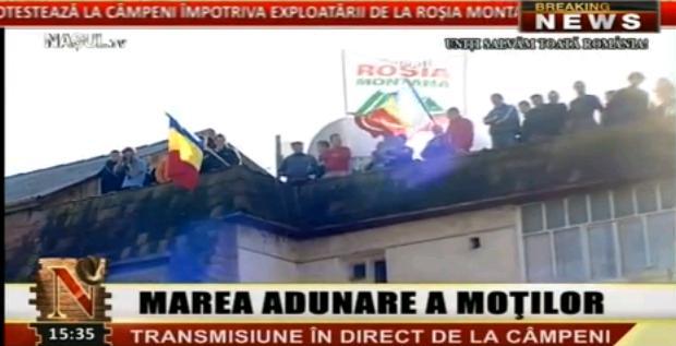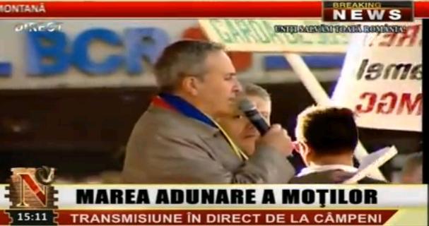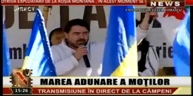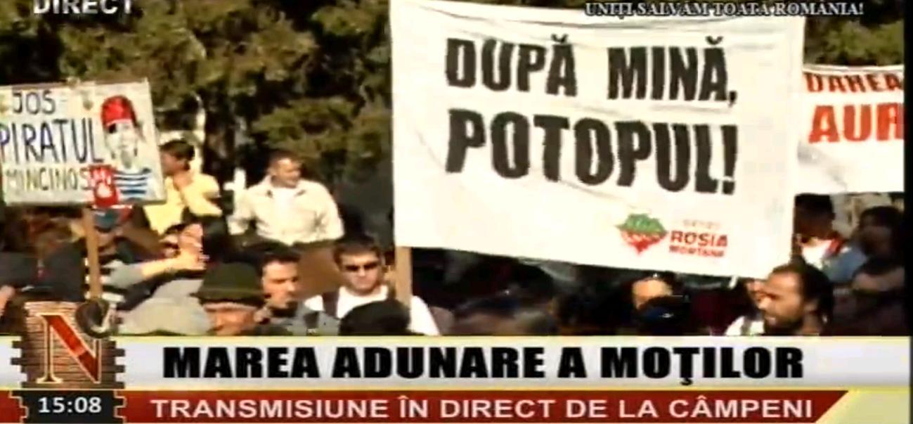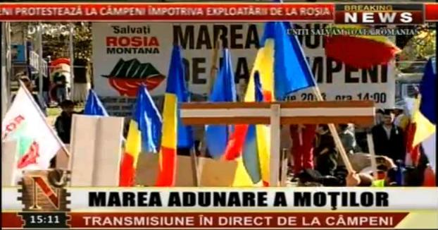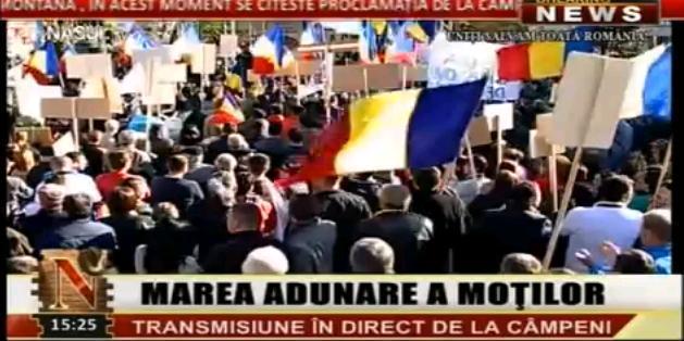 La această oră (19 octombrie, ora 14…)se desfăsoară la Câmpeni, judeţul Alba, marea adunare a moţilor. Se citeşte proclamaţia adunării în care se reiterează dreptul oamenilor de a-şi păstra pământurile şi mediul în stare bună, pentru a putea fi lăsate moştenire copiilor. Protestatarii cer refacerea şi dezvoltarea infrastructurii, dezvoltarea turismului, refacerea fondului forestier, creşterea animalelor, a apiculturii, a activitatilor specifice zonei. „Solicităm interzicerea prin lege a exploatarii gazelor de sist prin metoda fracturarii”, se anunţă în aplauzele celor cinci mii de locuitori prezenţi la adunare. Înarmaţi cu furci, coase, furci şi buzdugane de carton, pe care Adrian din Albac le-a realizat într-o săptămână de lucru.
