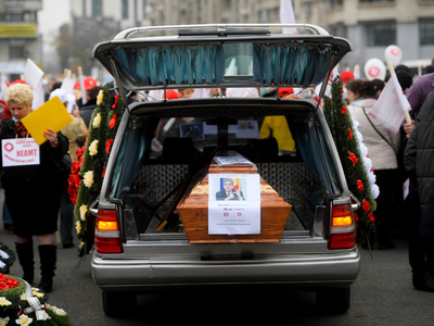 În primele rânduri ale coloanei de manifestanţi s-au aflat preşedintele Colegiului Medicilor din România, Vasile Astărăstoae, lideri ai Federaţiei Sanitare Sanitas. Urmaţi de manifestanţi cu coroane de flori, unul îmbrăcat în călugăr, cu o cruce pe care era scris „Sănătate” şi fotografia ministrului Eugen Nicolăescu. Poza ministrului Sănătăţii a fost lipită şi pe un sicriu în dricul care sugerează, potrivit organizatorilor, tot „Moartea Sănătăţii”. Pe sicriu a fost lipită o fotografie a lui Eugen Nicolăescu, cu mesajul „Domnule ministru, nu distrugeţi sănătatea României”, iar pe parbrizul dricului „Nu vrem spitale transformate în SRL-uri”.