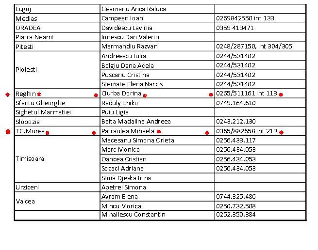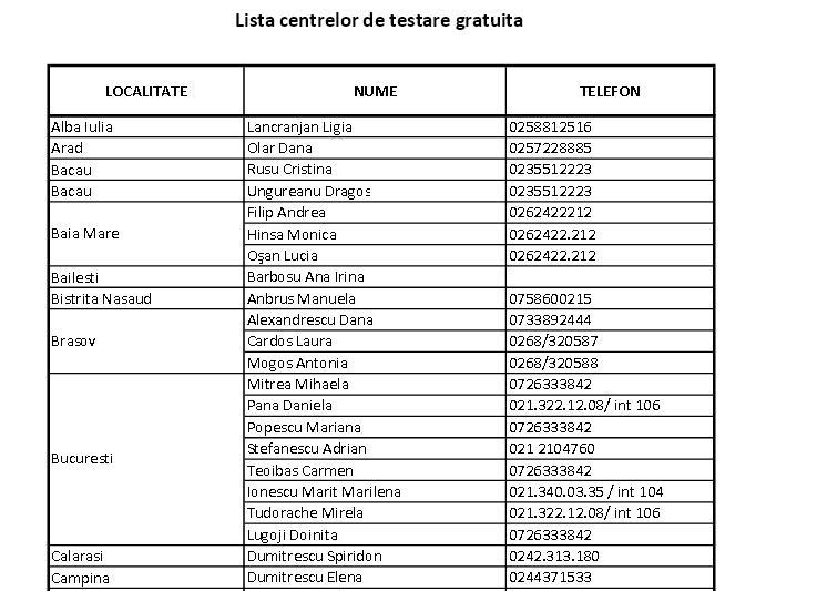 Testările pentru depistarea BPOC vor avea loc în oraşele — Alba, Arad, Bucureşti, Bacău, Baia Mare, Băileşti, Bistriţa-Năsăud, Braşov, Călăraşi, Câmpina, Cluj-Napoca, Constanţa, Craiova, Focşani, Galaţi, Hunedoara, Iaşi, Luduş, Lugoj, Mediaş, Oradea, Piatra Neamţ, Piteşti, Ploieşti, Reghin, Sfântu Gheorghe, Sighetu Marmaţiei, Slobozia, Târgu Mureş, Timişoara, Urziceni şi Vâlcea, pe baza unor programări la medicii şi clinicile care se găsesc în tabelul de mai jos.