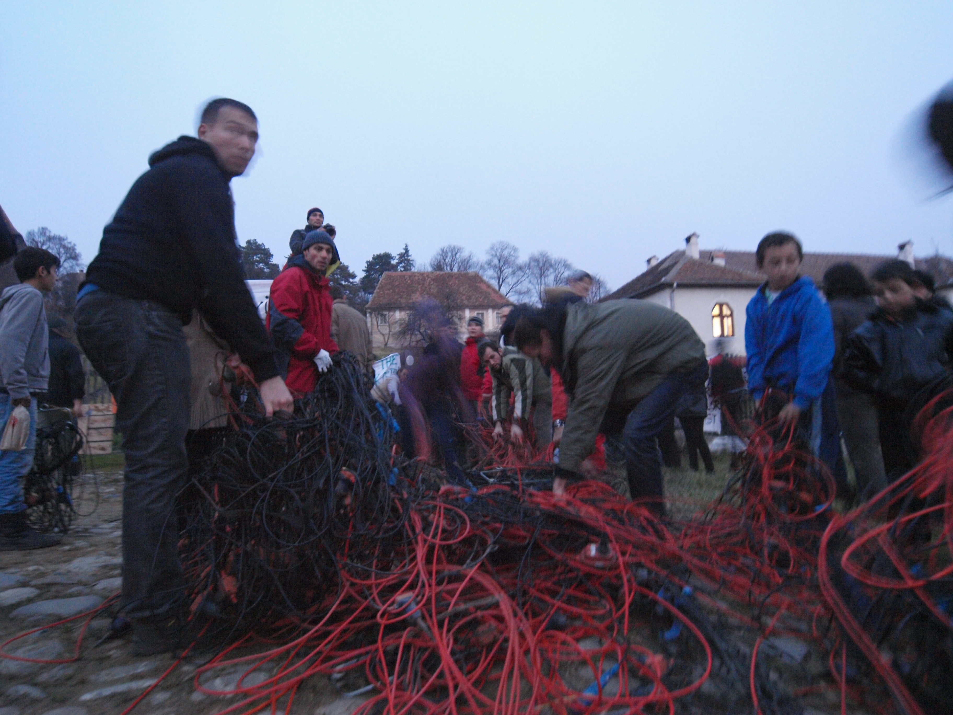 Aprox. la ora 18 directorul lucrarilor seismice al firmei PROSPECTIUNI, Ghe. Daianu – cel care ii amenintase si jignise in dimineata zilei de azi pe voluntari – s-a deplasat la caminul cultural din Alma Vii, intentionand sa-si recupereze cablurile luate de protestatari. Aparent, Daianu nu intelese avertismentul sever pe care-l primise in dimineata zilei de azi din partea protestatarilor, astfel incat a trebuit sa fie aparat la Alma Vii de catre Jandarmii inca prezenti la evenimentul de protest. A fugit apoi cu masina, lovind-o de un stalp.
