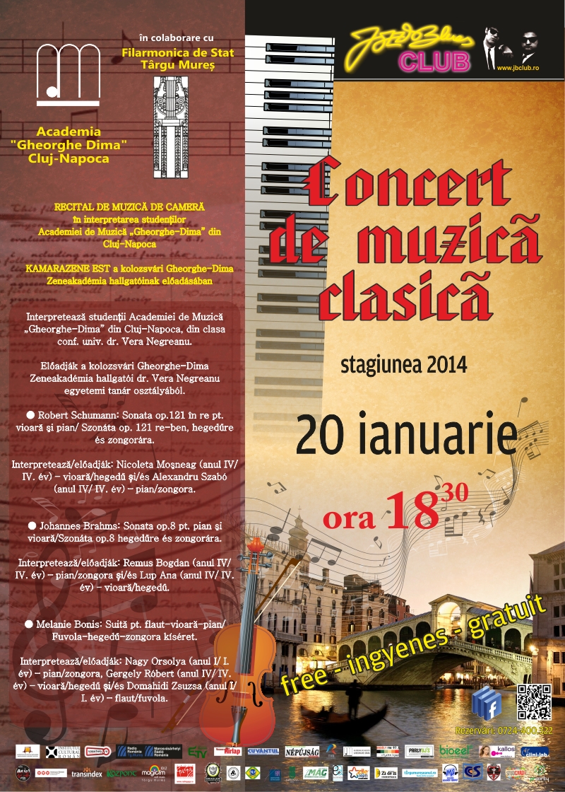 În Salonul Piano al clubului Jazz&Blues, luni, 20 ianuarie, începând cu ora 18.30, concert cameral în interpretarea studenţilor Academiei de Muzică Gheorghe-Dima din Cluj-Napoca, clasa conf. univ. dr. Vera Negreanu. În repertoriu: Sonata Op.121 de ROBERT SCHUMANN; Sonata Op.8 pentru pian şi vioară de la JOHANNES BRAHMS, Suită pentru flaut-vioară-pian de la MELANIE BONIS. Vor interpreta: Nicoleta Moşneag (anul IV) – vioară, Alexandru Szabó (anul IV) – pian, Remus Bogdan (anul IV) – pian, Lup Ana (anul IV) – vioară, Nagy Orsolya (anul I) – pian, Gergely Róbert (anul IV) – vioară și Domahidi Zsuzsa (anul I) – flaut. Intrarea este liberă.