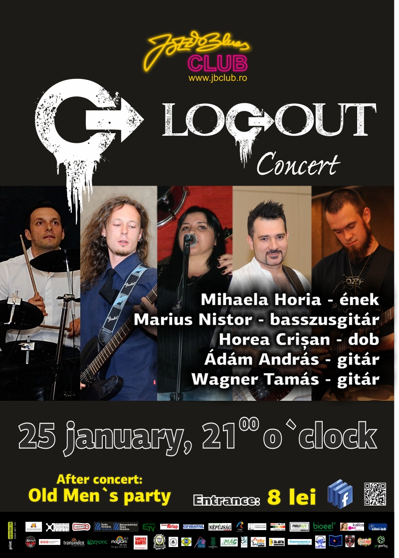 Sâmbătă, 25 ianuarie, începând cu ora 21.00, primul OLD MEN`S PARTY din acest an, în Salonul Piano al clubului Jazz&Blues! Seara va fi deschisă de concertul formaţiei Logout Rock Band din Cluj-Napoca, după care va urma o petrecere minunată până în zori cu dj Döme. Membrii formaţiei sunt: Mihaela Horia (voce), Marius Nistor (chitară bass), Horea Crişan (percuţie), Ádám András (chitară) şi Wagner Tamás (chitară). Biletul de intrare costă 8 lei. Pentru rezervare masă sunaţi la: 0724-400322.