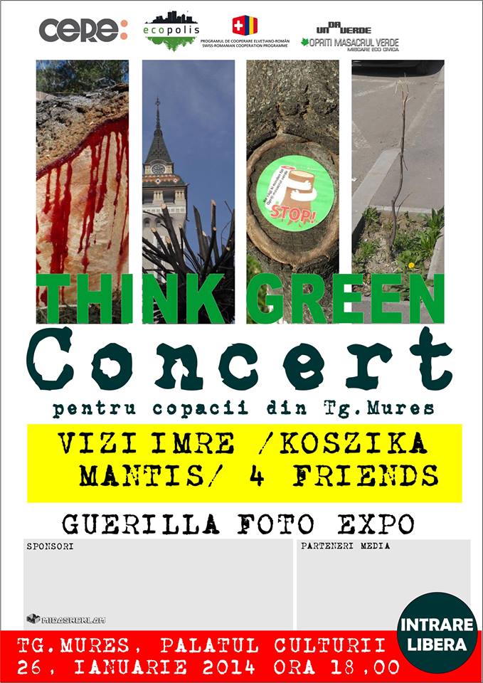 Un concert susţinut de Vizi Imre, Koszika, Mantis şi 4 Friends va avea loc în 26 ianuarie 2014 de la ora 18.00, cu intrarea liberă la palatul Culturii din Târgu Mureş. Concertul dedicat arborilor din oraş face parte din Campania THINK GREEN! Opriţi masacrul verde! Ne Vágj Ki Minden Fát!