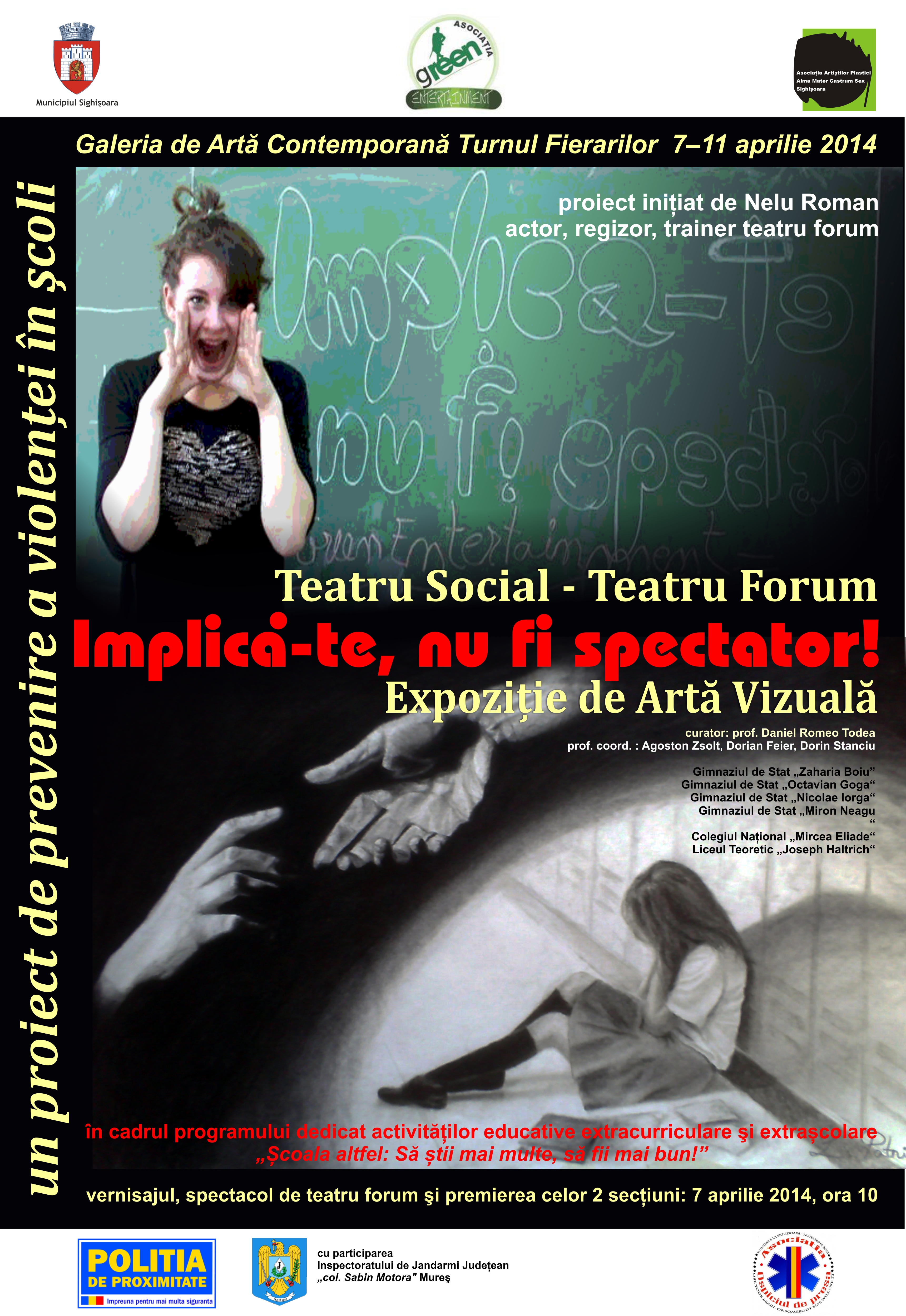 Proiectul propus şcolilor sighişorene de Asociaţia Green Entertainment în parteneriat cu Asociaţia Artiştilor Plastici „Alma Mater Castrum Sex” şi Municipiul Sighişoara are ca temă violenţa în şcoli. Începând cu 31 ianuarie 2014 au fost iniţiate work shopuri ale căror rezultate au fost prezentate practic la acest eveniment. S-a lucrat pe două secţiuni, prin metoda Teatrului Forum şi de artă vizuală. Astfel, 10 elevi conduşi de trainerul grupului, actorul şi regizorul Nelu Roman, au pregătit un spectacol intitulat „Alo…pissy!”, în maniera Teatrului Forum. Prezentată în premieră la acest eveniment, piesa a suferit numeroase modificări, după cele 12 intervenţii ale publicului, în cele din urmă personajul „opresor” ajungând să fie izolat.