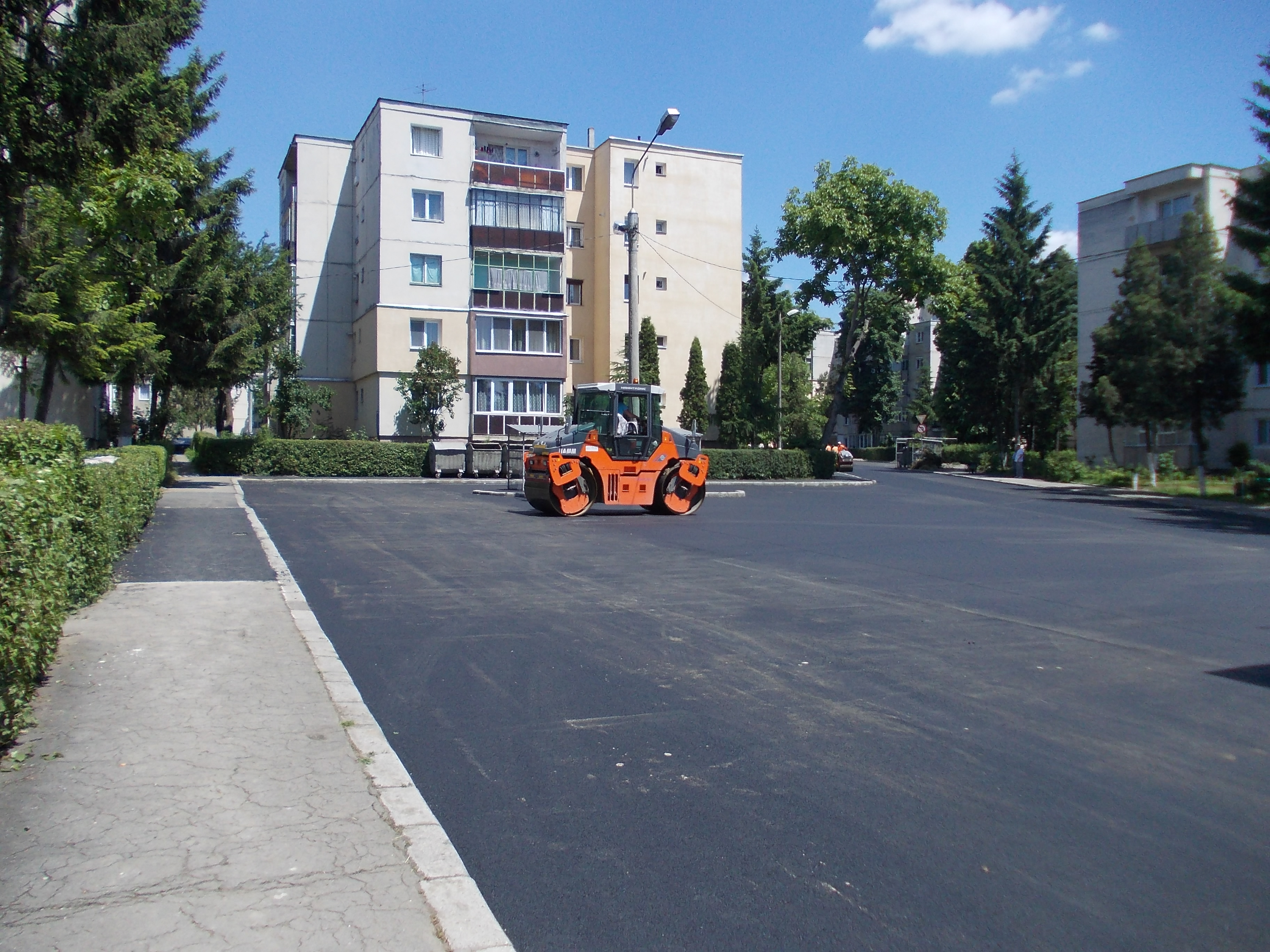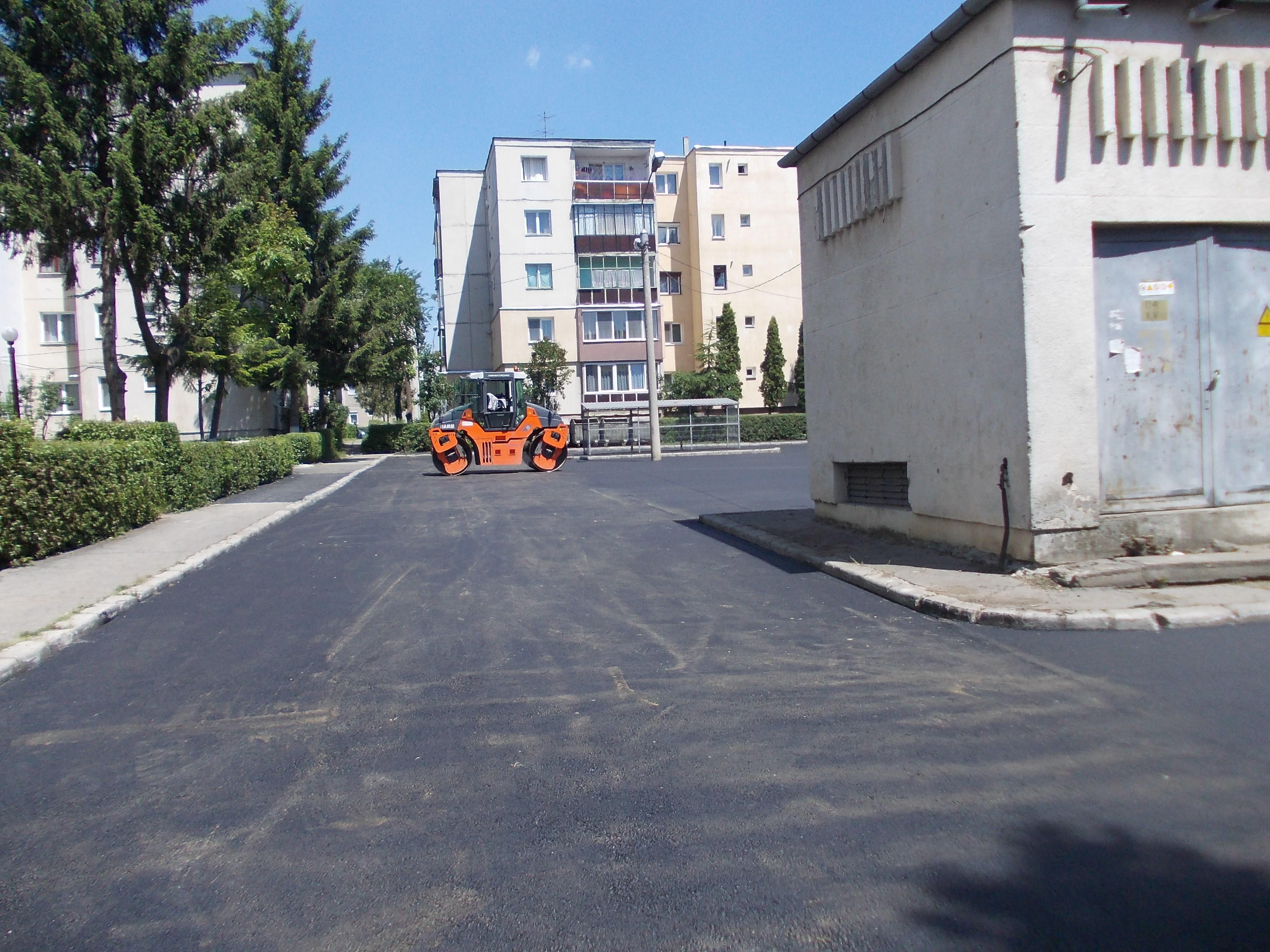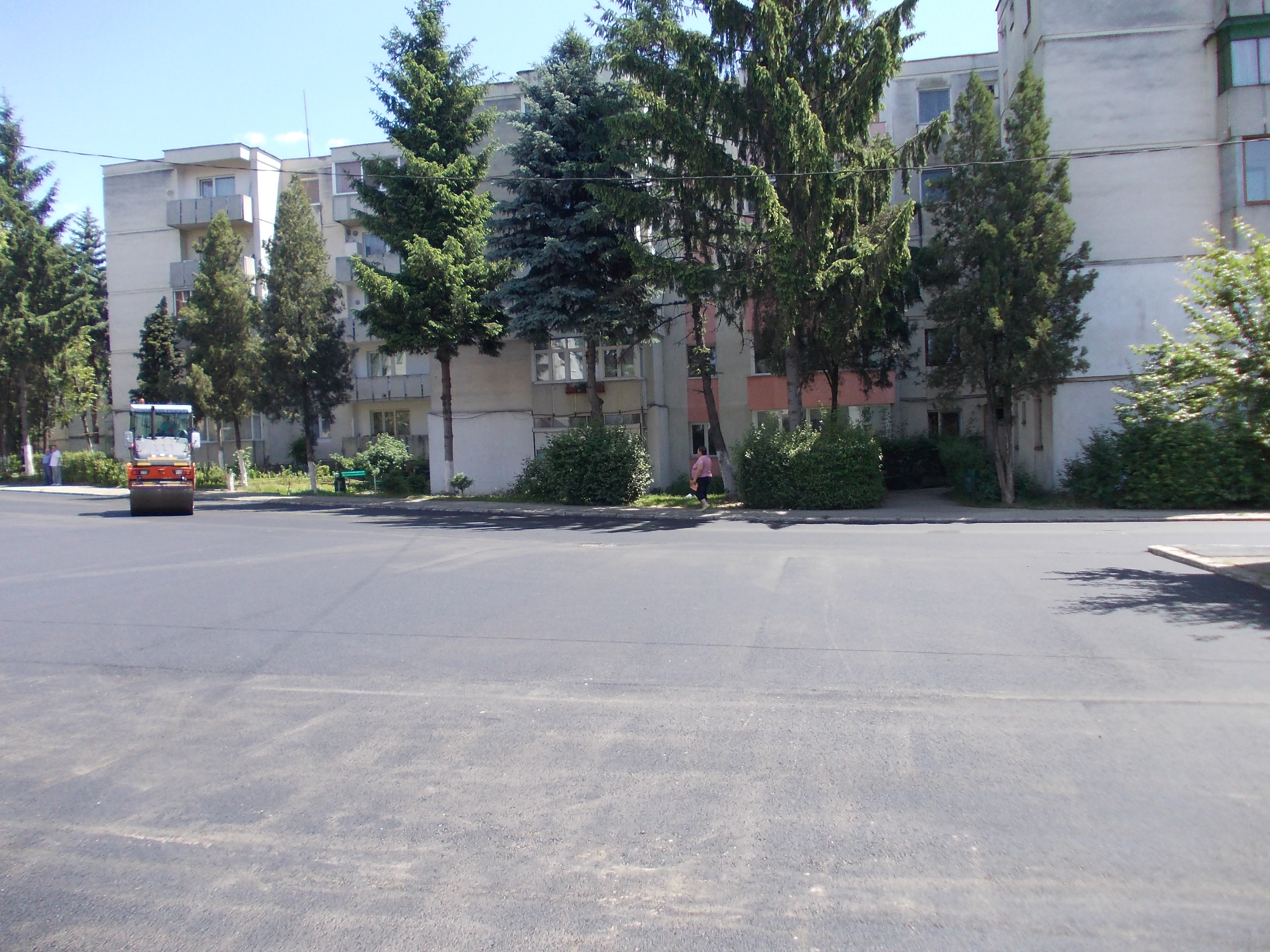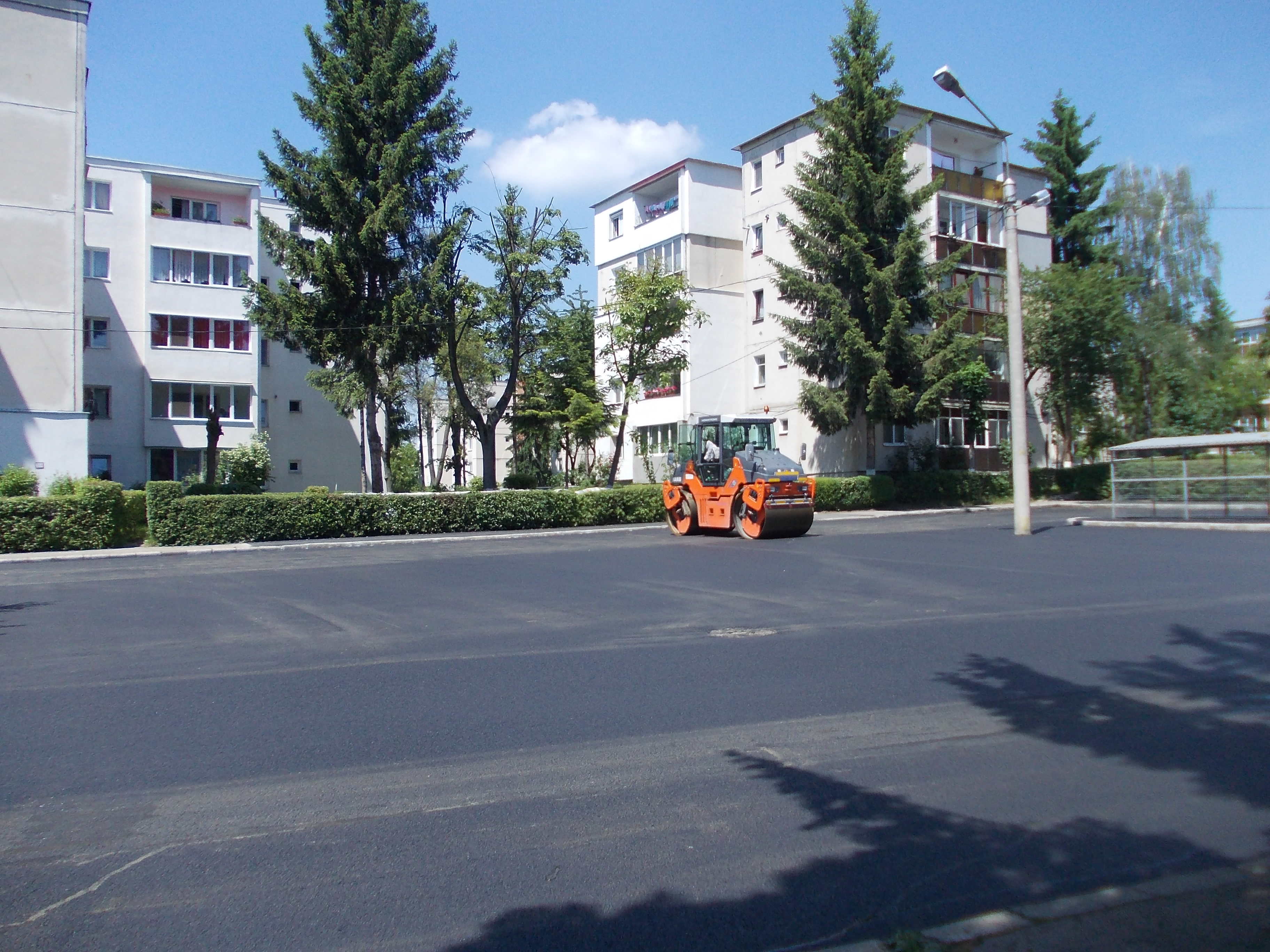 Nu odată m-am strecurat printre maşinile parcate de -a valma, iarna făcând echilibristică printre hârtoapele acoperite cu gheţuş, pe trotuarul plin de gropi ce atenta la tocurile încălţămintelor. Ieri, spre satisfacţia copiilor din zonă, toată suprafaţa între blocuri a fost asfaltată şi lăsată până azi la discreţia micilor fotbalişti, care s-au folosit din plin de terenul neted ca în palmă, încă mirosind a smoală la cele 26 de grade Celsius. Nu-mi amintesc să fi imortalizat priveliştea dinainte de 20 mai, ieri în schimb, fascinată lucrarea în plină desfăşurare, am reţinut câteva imagini pentru memoria blogului. Mă mândresc cu ele, evident!