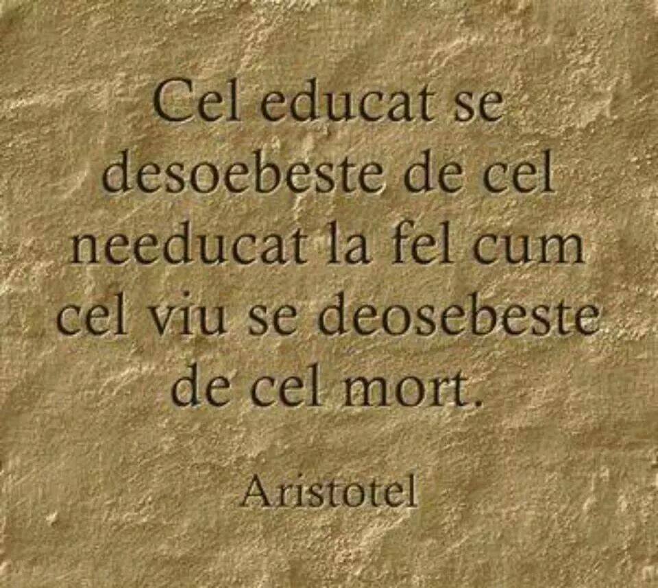 De unde ştiu? Simplu. Am deschis feisbucu şi printre tot felul de invitaţii la jocuri (la care nu mă pricep şi nici nu vreau să le învăţ), ştiri demult fumate, preluate de unii care s-au trezit mai târziu, am ajuns şi la vorbele de duh, distribuite cu mare drag. Astfel am găsit acest carton pe care cineva cu mare răbdare a scrijelit o zicere de a lui Aristotel despre deosebirea între un om educat şi altul needucat. Care e problema? Una mică! Dacă zicerea îi aparţine lui Aristotel, trebuia pusă între semnele citării. Dacă nu a pus semnele citării, cel care a postat-o nu trebuia să semneze cu numele filozofului. Mai mult de atât, în niciun caz nu ar fi trebuit să scrie greşit termenul care face deosebirea!