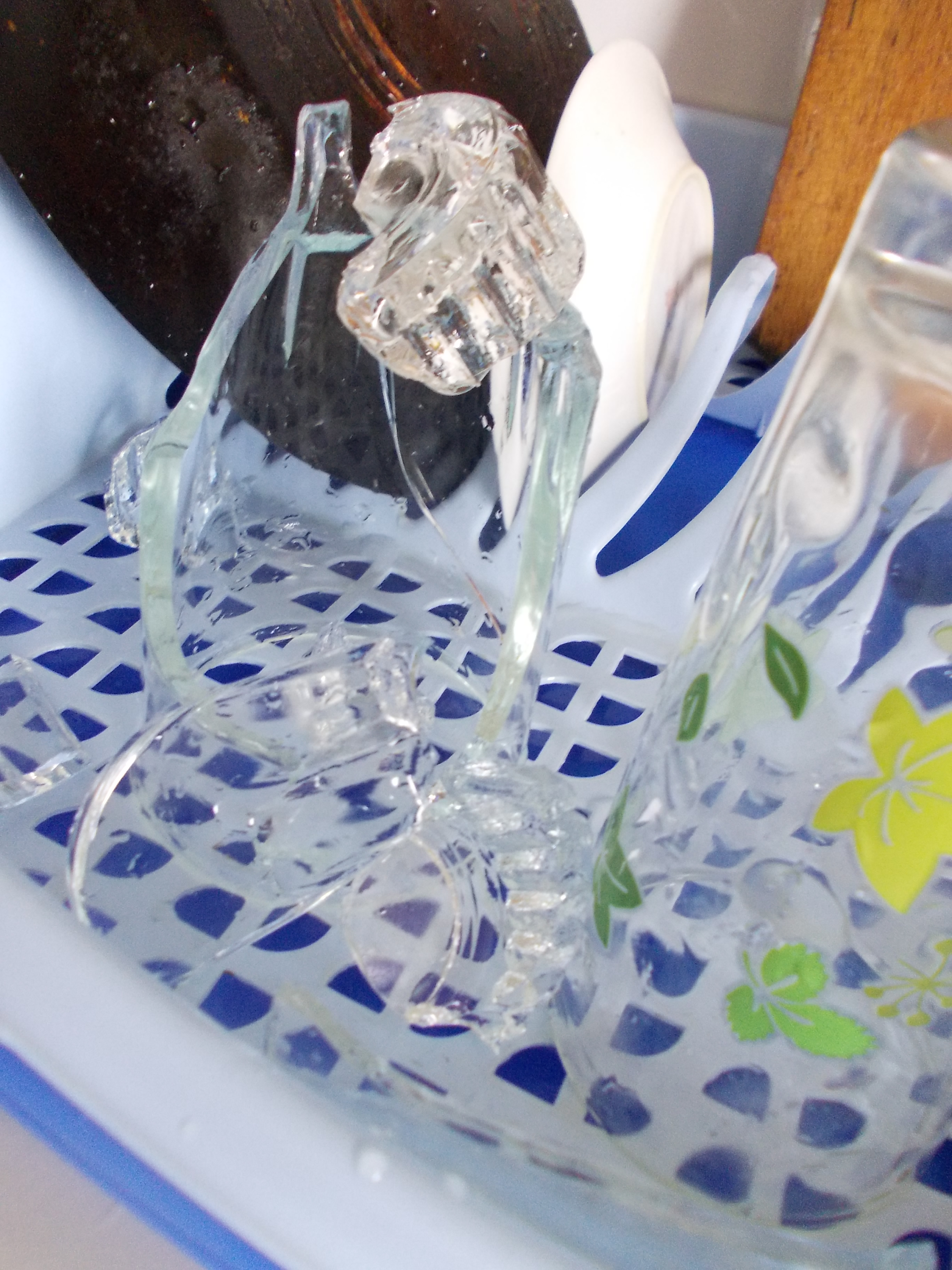 Am cumpărat 12 pahare de apă de la un market de cartier. Le-am ales bucată cu bucată, le-am transportat cu grijă, le-am spălat cu mare atenţie şi primul din ele s-a crăpat sâmbătă 31 mai. Apoi într-o zi s-a mai spart unul, nu cunosc detalii. Ieri în schimb, paharul proaspăt spălat, lăsat lângă altele în picurător pe nepusă masă a zis poc şi s-a destrămat! A explodat pur şi simplu! Uite aşa!