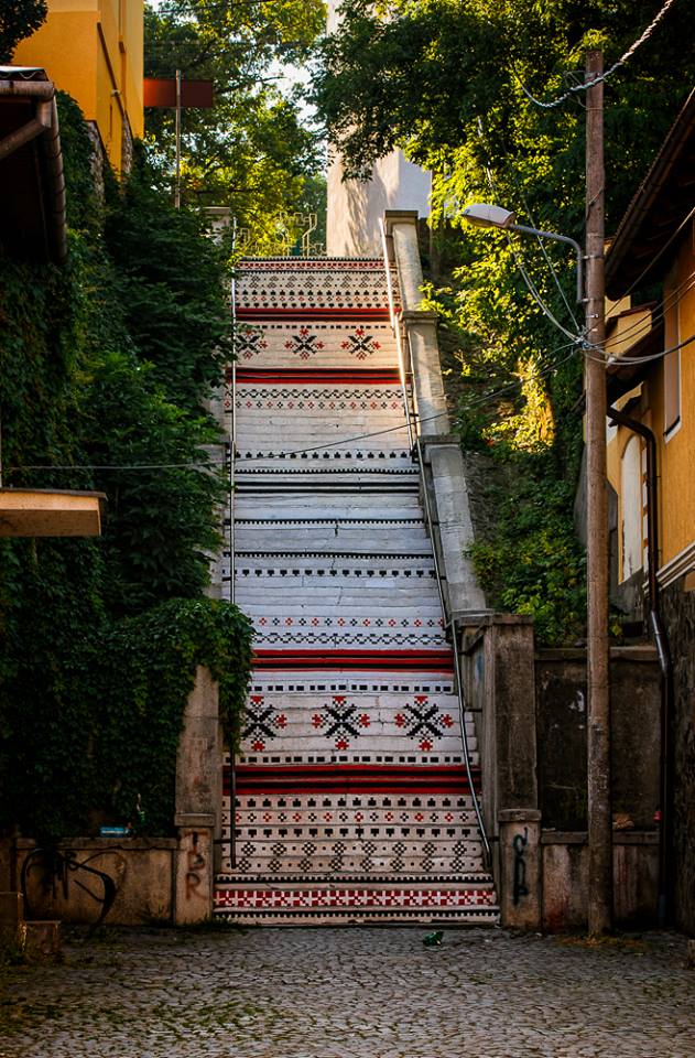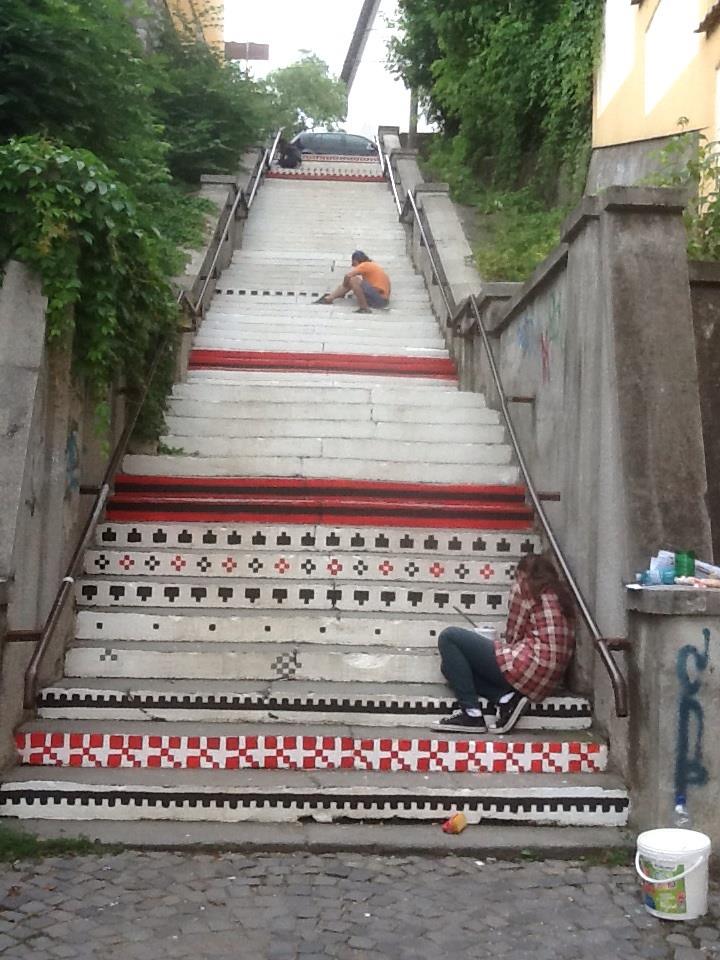 Leagă oraşul de jos cu dealul cetăţii. Are 72 de trepte, le-am numărat! Cândva le urcam în fugă şi le coboream sărind ca o capră turbată peste mai multe trepte deodată! Bine, acum le cam evit…la sfatul medicului. Dar asta nu mă împiedică să le consider cele mai frumoase trepte pe care le-am văzut vreodată pe meleagurile noastre şi nu numai! Într-o zi am văzut o postare pe facebook, (unde altundeva puteam s-o văd) despre trei tineri ce munceau de zor, dar nu bănuiam ce are să iasă din îndeletnicirea lor! Iată postarea: