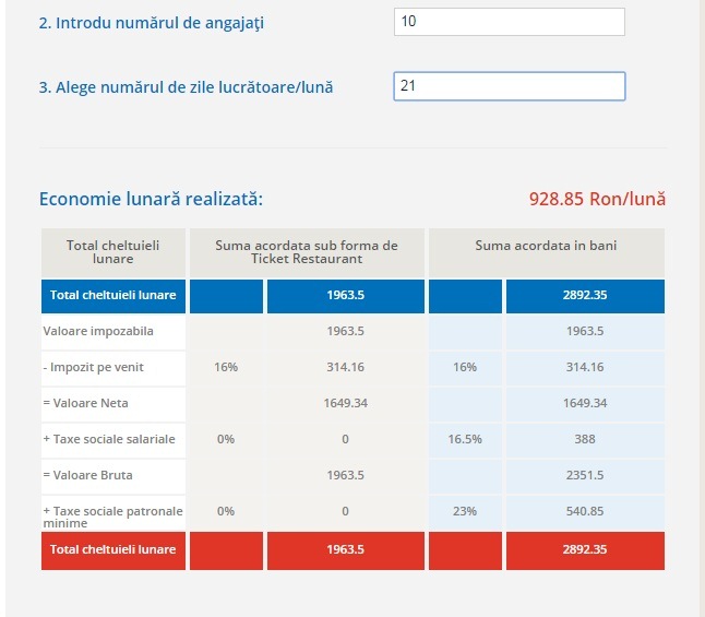 Un angajator care are 10 angajaţi economiseşte 928,85 lei pe lună oferind angajaţilor tichete de masă în loc de o mărire de salariu!
