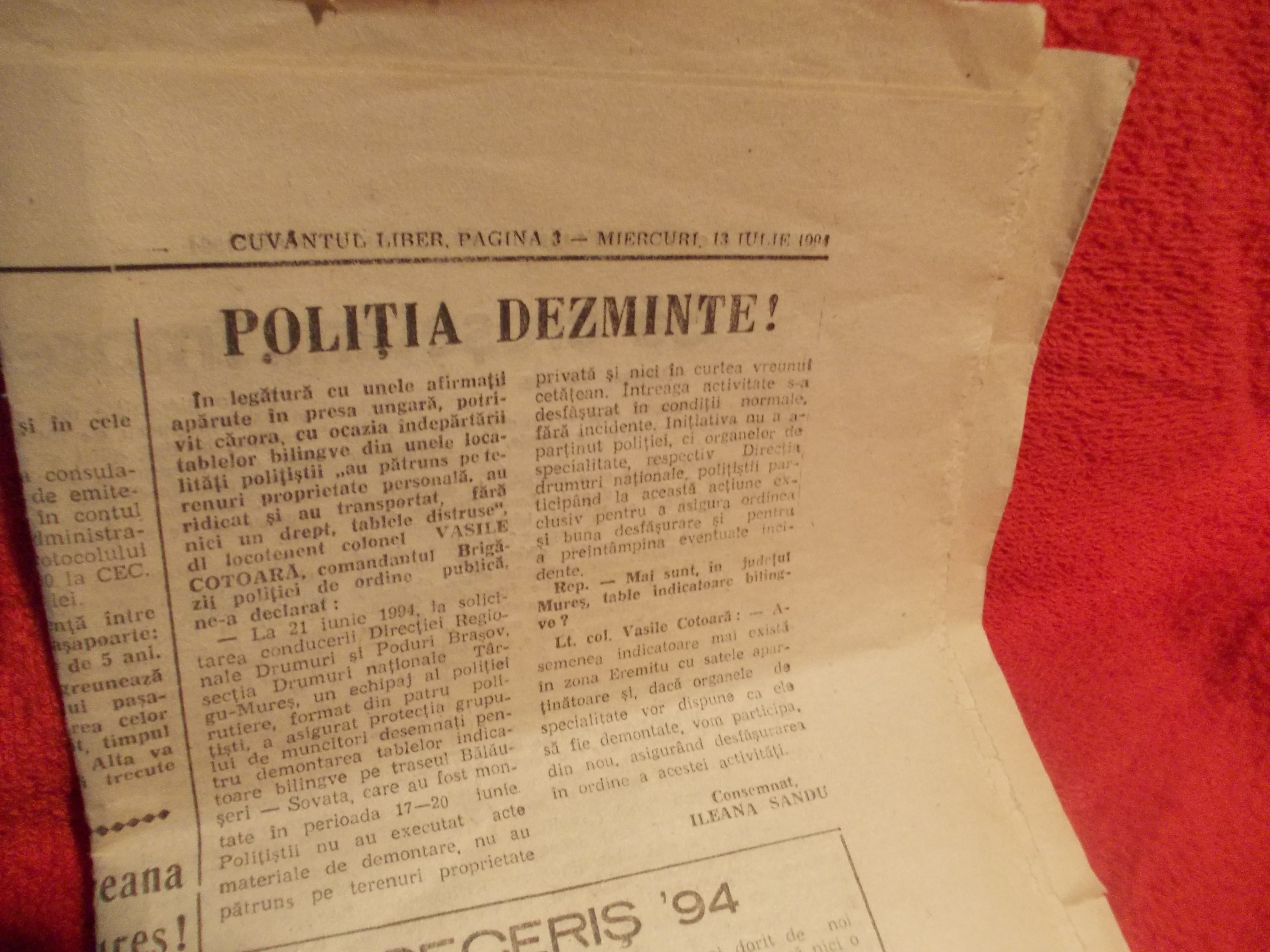 „În legătură cu unele afirmaţii apărute în presa ungară, potrivit cărora, cu ocazia îndepărtării tablelor bilingve din unele localităţi poliţiştii „au pătruns pe terenuri proprietate personală, au ridicat şi au transportat, fără niciun drept, tablele distruse”, dl locotenent colonel VASILE COTOARĂ, comandantul Brigăzii poliţiei de ordine publică, ne-a declarat: