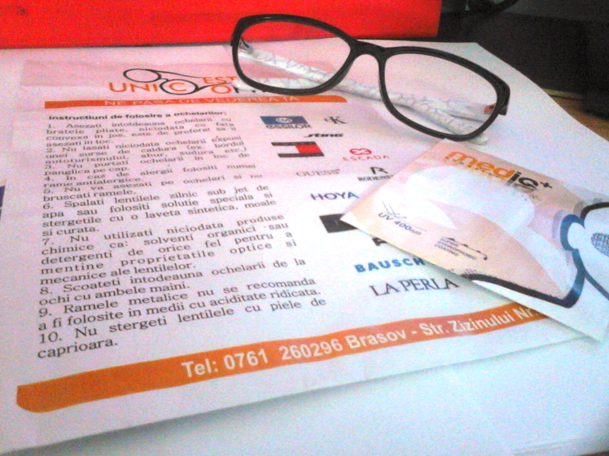 Am început cu fluturaşul găsit într-o zi la cutia de scrisori. „Firma specializată în servicii de optică medicală se deplasează în data de 2, 3, 4, 5 decembrie 2014, orele 10-16, în Tîrgu Mureş, în incinta Casei de Cultură a Sindicatelor pe str. Cuza Vodă nr. 22 , cu specialişti în domeniu şi cu aparatură computerizată”, mă anunţa „Aceeaşi firmă care revine de 2 ani la solicitarea dumneavoastră!”