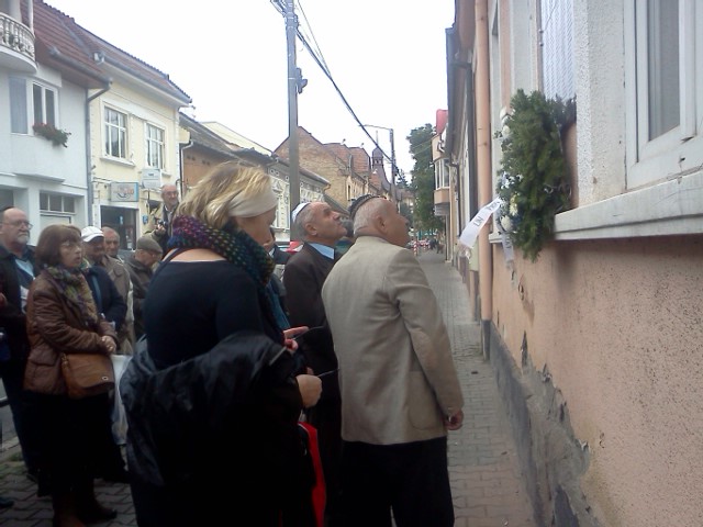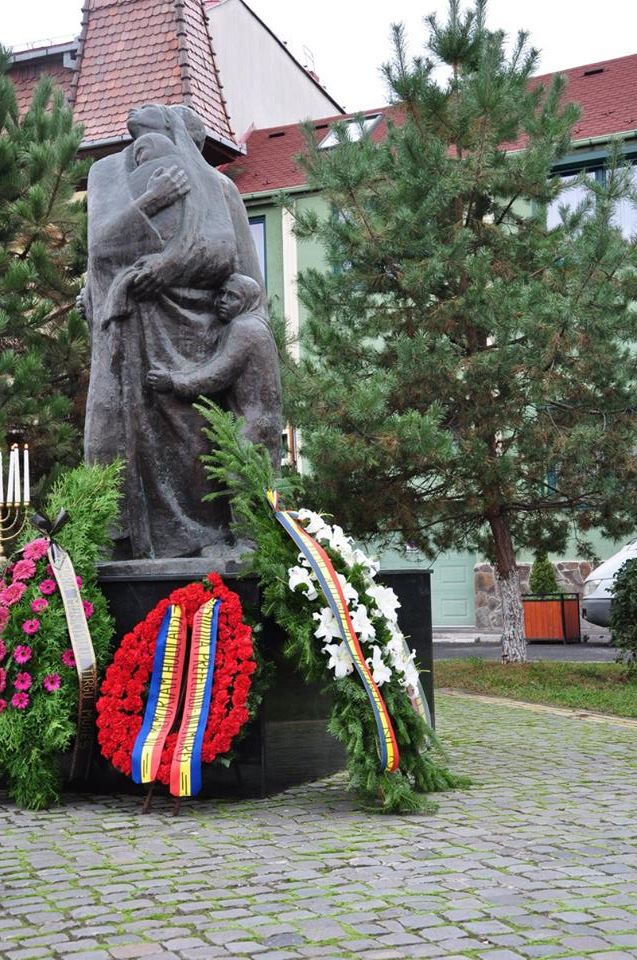O mână de oameni adunaţi în faţa statuii realizată de Izsak Marton, artistul care a reuşit să toarne în bronz spaima, durerea şi solidaritatea unor oameni, comemorează ani de ani, pe 9 octombrie, Victimele Holocaustului. Oraşul îşi duce traiul în ritmul său obişnuit. Concitadinii mei nu prea au habar cum au ajuns coroanele de flori şi luminările pe soclul statuii, ce caută grupul de oameni păziţi de jandarmi în parcul de pe strada Călăraşilor, colţ cu str. Arany Janos. Călătorii clevetesc în refugiu aşteptând autobuzul, alţii aruncă o privire şi trec mai departe. Profesorul Diamanstein Gheorghe, urmat de oficialităţile urbei: prefectul dr. Lucian Goga, primarul dr. Dorin Florea, preşedintele Consiliului Judeţean Ciprian Dobre rostesc alocuţiunile de rigoare. Preşedintele Comunităţii Evreieşti, Ladislau Dub încearcă să explice inexplicabilul, căutând cauzele ce au dus la ororile din lagărele de exterminare. În mai puţin de o oră parcul se goleşte. Care cum poate, ceva mai trişti decât la sosire, câţiva dintre participanţi se îndreaptă spre fosta şcoală nr. 4 unde urmează să fie dezvelită o placă de marmură în memoria celor 341 de şcolari evrei, deportaţi de pe băncile şcolii. Holocaust.