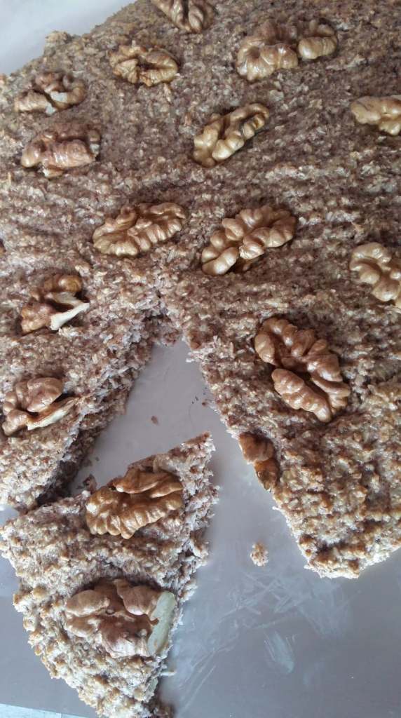 Între timp s-a înglobat și cocosul și materialul pare tot mai leșinat, așa că mai adaug câteva linguri de miez de nucă măcinată și un praf de sare de Himalaya-e roz și mai înviorează materialul din bol, peste care am aruncat și un gând de praf de copt și niscaiva coajă rasă de lămâie. Amestecând cu grijă, deși nu mai aveam ce strica, am transferat materialul în tava tapetată cu hârtie de copt, am înfipt câteva jumătăți de nucă pentru decor și …la cuptorul preîncălzit cu el!