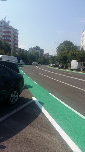 Pe un drum lat cum e bulevardul din imagine, cu patru benzi, e loc și pentru pista desenată, dar acolo unde e drumul mai strâmt, e o probă de îndemânare ca să te strecori fără să încurci circulația. Linia întreruptă de fapt vine în ajutorul autobuzelor care nu încap pe banda lor fără să nu treacă peste linia continuă ori să fure din pista de biciclete. Explicația părinților acestei mari realizări este că trebuie să avem grijă unii de alții, participanții în trafic.