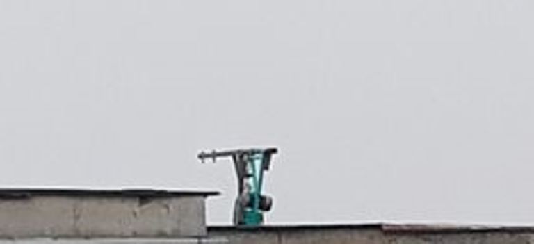 Detalii ajutătoare: e pe acoperișul unui bloc. are un fel de stativ, cu chenar, o bucată verde, un burlan, un fel de butoi…