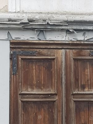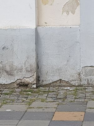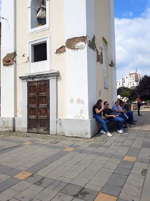 O bancă rezemată de turnul unei foste biserici, demolată ca să se facă loc clădirii teatrului asigură o dâră de umbră. Cei care s-au așezat acolo sigur nu s-au uitat în sus! Deasupra lor atârnă o bucată ascuțită de tencuială desprinsă mai mult de jumătate de pe zidul turnului. Certificat de pauperitate!