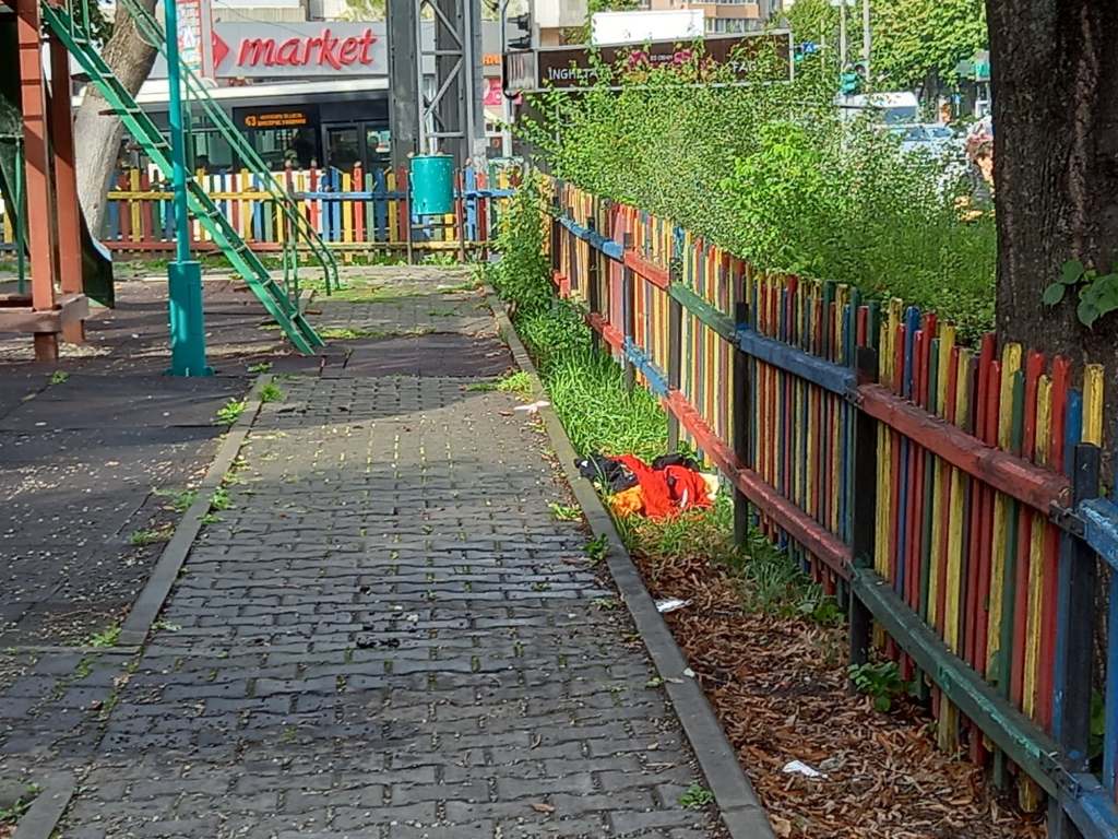 După o aversă anunțată, în ultimele zile de vacanță, parcul pare părăsit. Fără bănci sub copăcei, cu mult pietriș și o tentativă de spațiu verde printre alei, fără covor cauciucat, …dar cu gunoiul aruncat pe lângă gard.