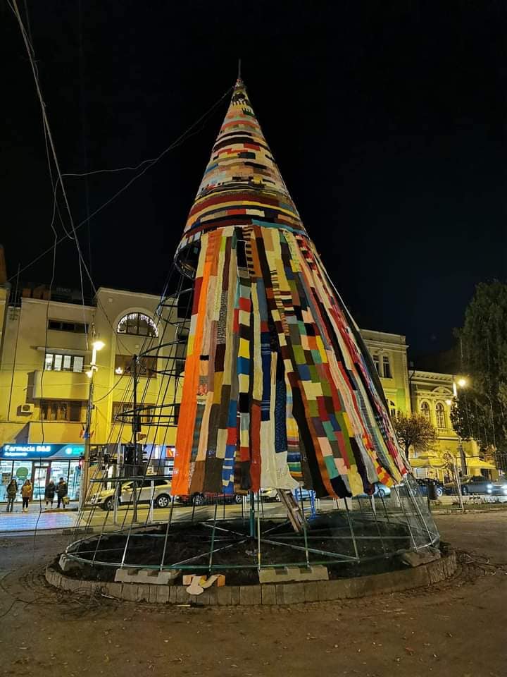 Bradul din centru e confecționat din fulare, covoare țărănești și pleduri colorate. Explicația ar fi că avem de a face cu o tentativă de intrare în cartea Recordurilor. Adică bradul nostru ar fi un unicat. Ar merita titlul de ”Bradul care ne unește” prin lungimea fășiilor tricotate manual de persoane din mai multe colțuri ale lumii. Asta susțin gurile rele, dar n-am văzut încă ”unde scrie asta?”