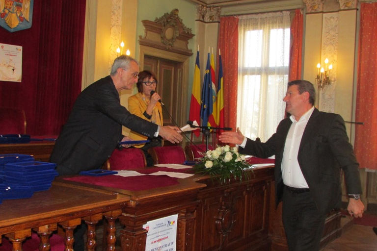 Ultima etapă a evenimentelor dedicate aniversării unui deceniu de excelenţă în handbal s-a desfăşurat în frumoasa sală barocă a Primăriei municipiului Sighişoara. Îndeplinind rolul de gazdă, Alina Aldea, purtătorul de cuvânt al Primăriei a salutat auditoriul şi a propus ca să se ţină un moment de reculegere în amintirea celui care a fost câştigător al Cupei Cupelor Federaţiei Europene de Handbal, Marian Cozma. Evenimentul a continuat cu prezentarea distinşilor oaspeţi prezenţi la aniversare: Gabriela Szabo, ministrul Tineretului şi Sportului, Alin Păunescu -inspector general, Alexandru Spiridon – inspector la Ministerul Educatiei şi Cercetării, Ştefan Someşan – inspector general, Sorin Pătru Adrian Rucoi, inspectori I.S.J. Mureş, Nicolae Neagu, reprezentant din partea UMF Tîrgu Mureş, Mihai Bocan- secretar general, Robert Licu, Sorin Toacsen, Radu Voina, Marius Iliuţă de la Federaţia Română de Handbal, Lia Suciu – director al Colegiului Naţional „Mircea Eliade” Sighişoara, Mariana Gorczyka, fost director al Colegiului Naţional „Mircea Eliade” la înfiinţarea Centrului Sighişoara, Gheorghe Forsea – directorul Clubului Sportiv Şcolar şi al Centrului Naţional de Excelenţă Sighişoara.