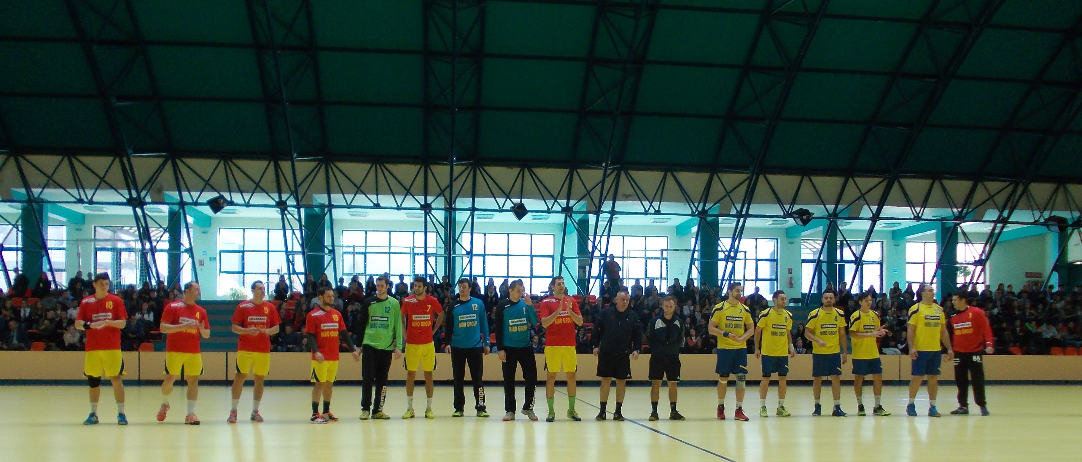 Într-o atmosferă incendiară, cu muzica antrenantă, copiii au întâmpinat cu aplauze jucătorii care şi-au făcut apariţia pe terenul Sălii Polivalente. În tribune alături de micii spectatori au luat loc oficialităţile locale şi judeţene, dar şi reprezentanţi ai Federaţiei Române de Handbal, în frunte cu Gabi Szabo, ministrul Tineretului şi Sportului. Partida susţinută de echipele absolvenţilor a fost condusă de cei doi arbitri: Rucoi Adrian şi Cociş Claudiu. Înainte de fluierul de început, în aplauzele spectatorilor au fost prezentaţi jucătorii celor două echipe, gazdele în echipament roşu, oaspeţii în galben. Cu excepţia celor doi pivoţi mai scunzi, toţi jucătorii, înalţi ca nişte baschetbalişti, au jucat cu mult entuziasm. Scorul de pe tabela de marcaj se schimba aproape la fiecare minut, cel mai des în favoarea oaspeţilor. Se aruncau mingi foarte lungi, uneori bubuia placajul în spatele porţii semn că nu a fost nimerită poarta, alteori strigătele spectatorilor acopereau zgomotul mingii aruncate cu putere sub picioarele portarului ori peste braţele lui. A fost şi un fault, un cartonaş galben, o aruncare de la 7m, scorul oscilând când în favoarea uneia, când în favoarea alteia dintre echipe. În cele din urmă prima repriză s-a încheiat cu un scor alb, 19 la 19.